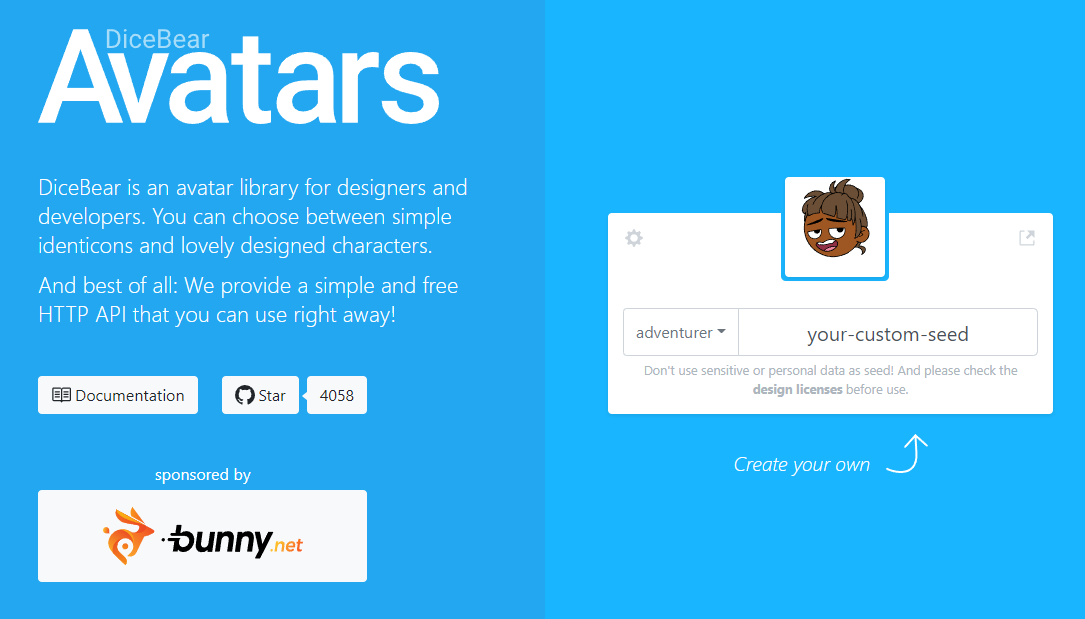 DiceBear is an avatar library for designers and developers. You can choose between simple identicons and lovely designed characters. And best of all: We provide a simple and free HTTP API that you can use right away!
