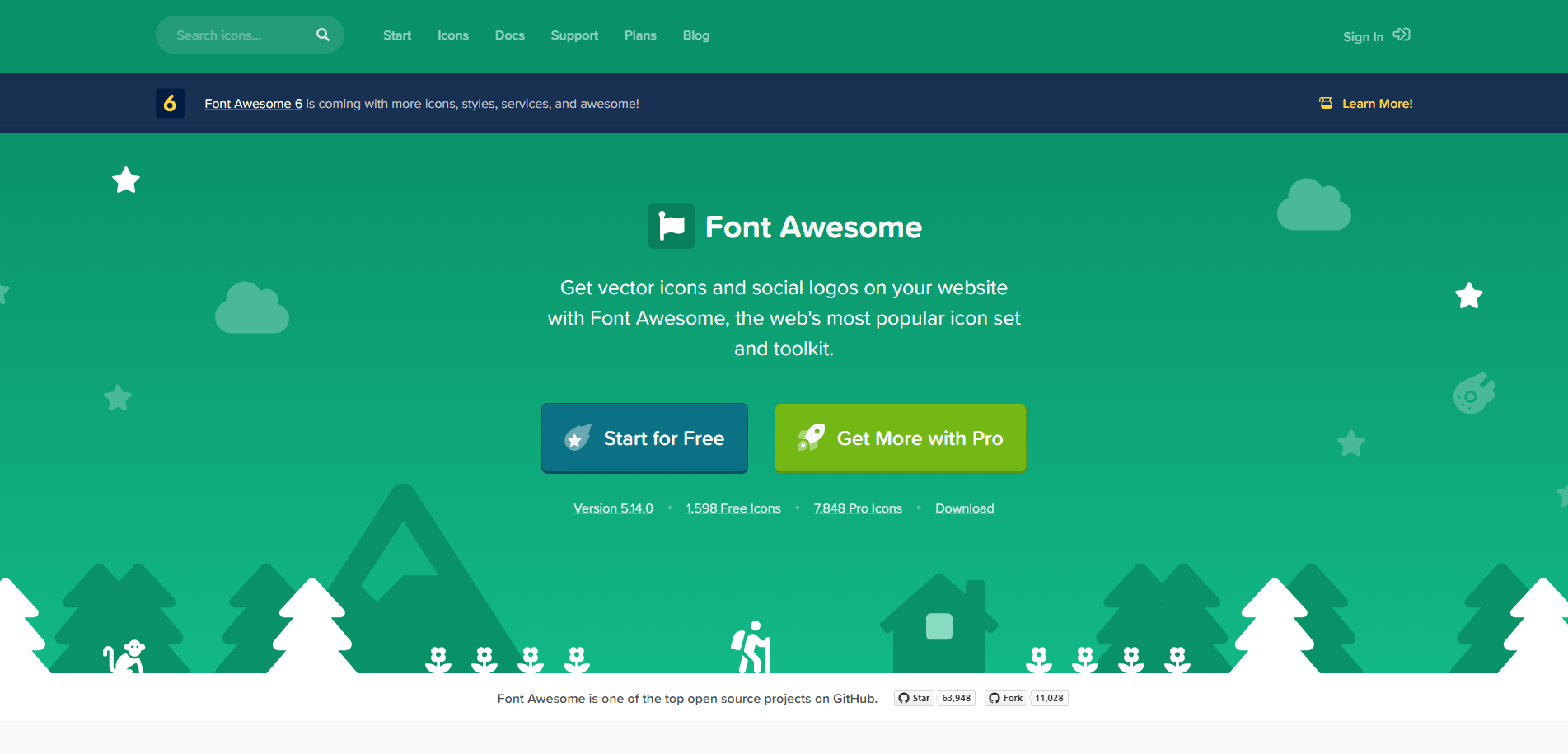 Font Awesome의 홈페이지에 들어가면 크게 보이는 버튼 중, "Start for Free"을 눌러 회원가입을 하고 프로젝트를 등록하면 CSS 링크를 받을 수 있습니다.