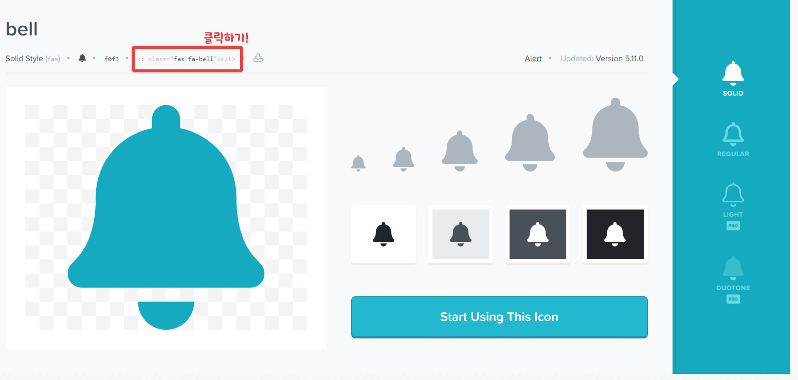 그 후 fontawesome.com/icons?d=gallery&m=free로 이동해서 아무 아이콘을 클릭해봅니다.