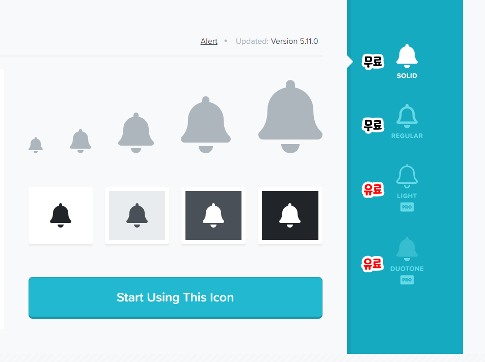일부 아이콘은 유료로 제공하고 있기 때문에 프로 라이선스를 구독하지 않는다면 무료 아이콘을 써야 합니다.