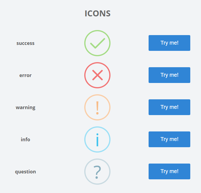 SweetAlert2에는 아래와 같이 5가지 타입을 지원하기 때문에 용도에 맞게 잘 활용하시면 되겠습니다.