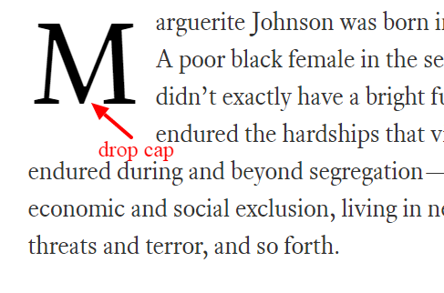 위와 같이 문단 가장 앞의 글자를 크게 써 두는 것을 Drop Cap 이라고 합니다.