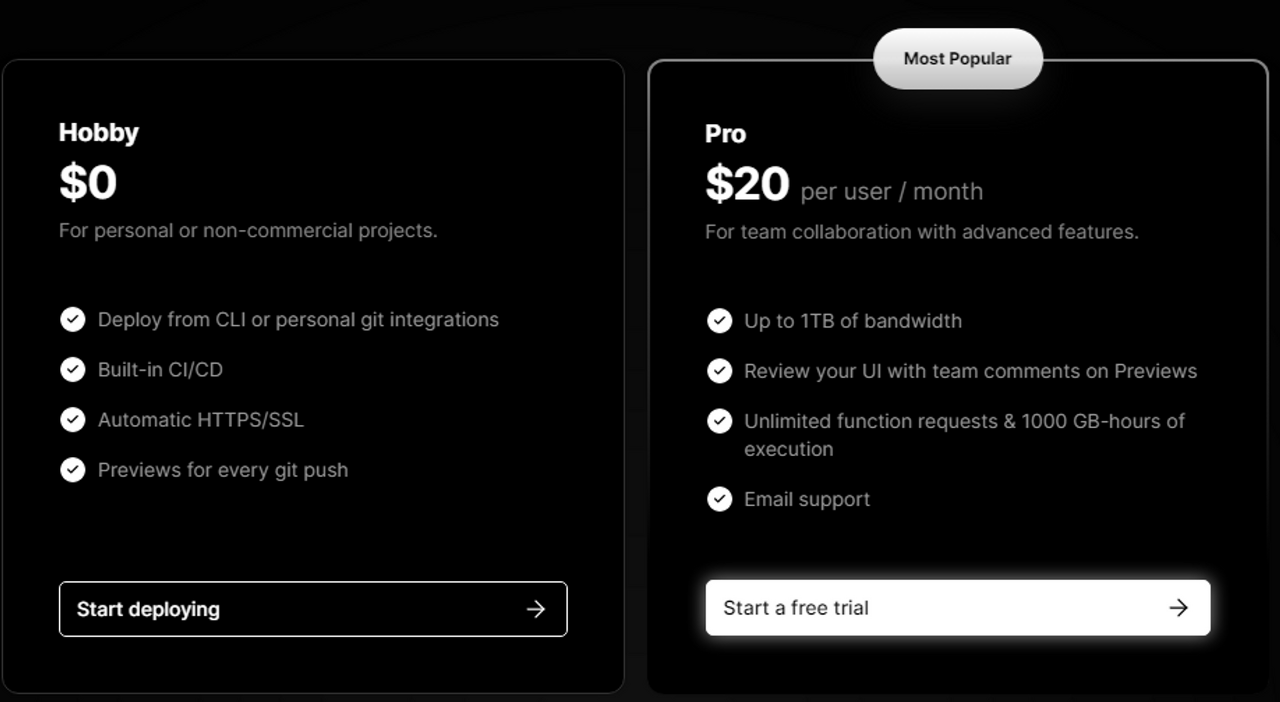 그러다 vercel을 만나면서 앞서 말한 두 서비스보다 빠르고, 배포도 쉽고, 가격도 저렴했기 때문에 vercel의 매력에 빠지면서 애용하게 되었다.