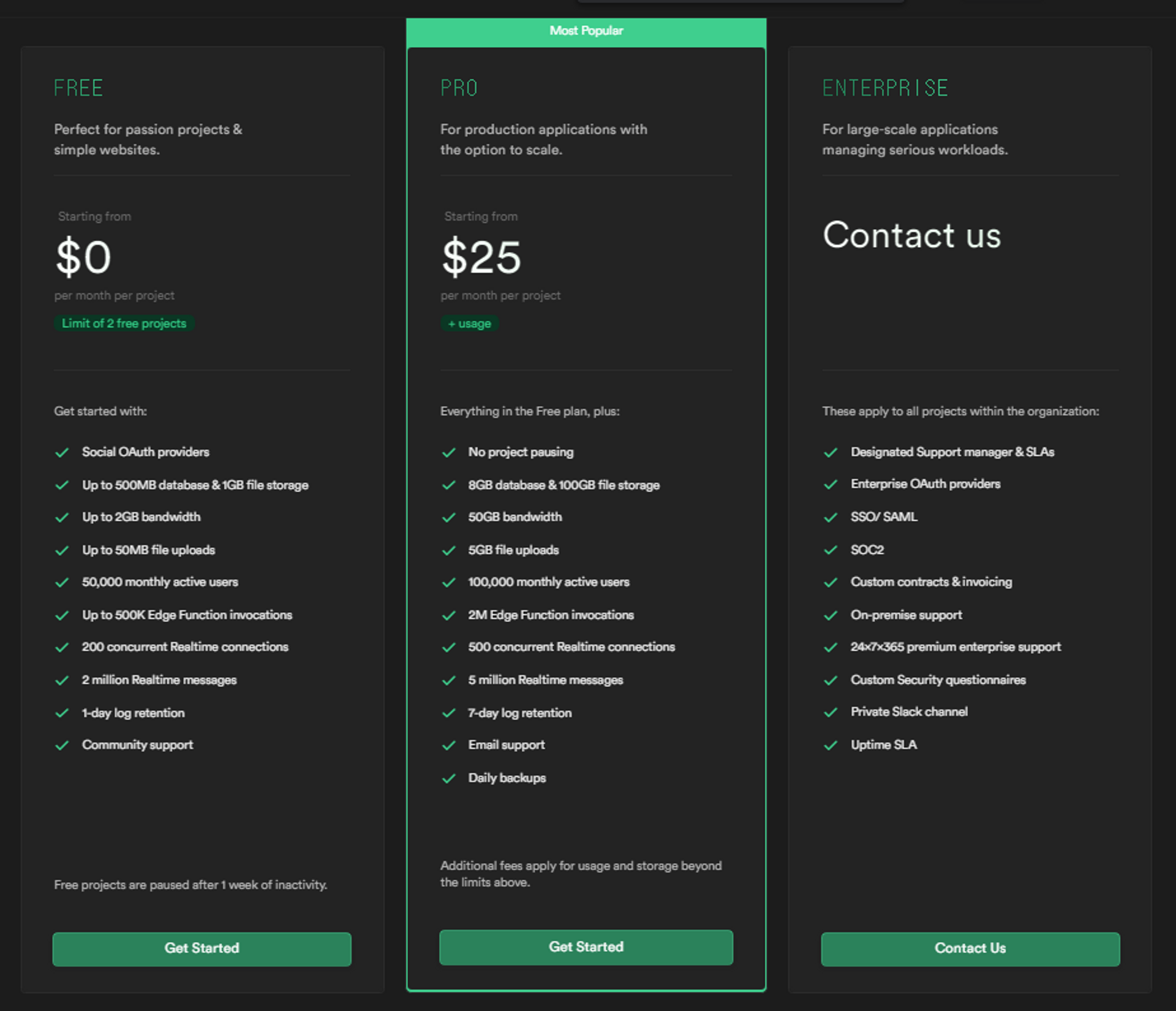supabase의 프리티어는 아래만큼의 리소스를 사용할 수 있습니다. 토이프로젝트로 사용해 보기 딱 좋은 양의 리소스이다.
