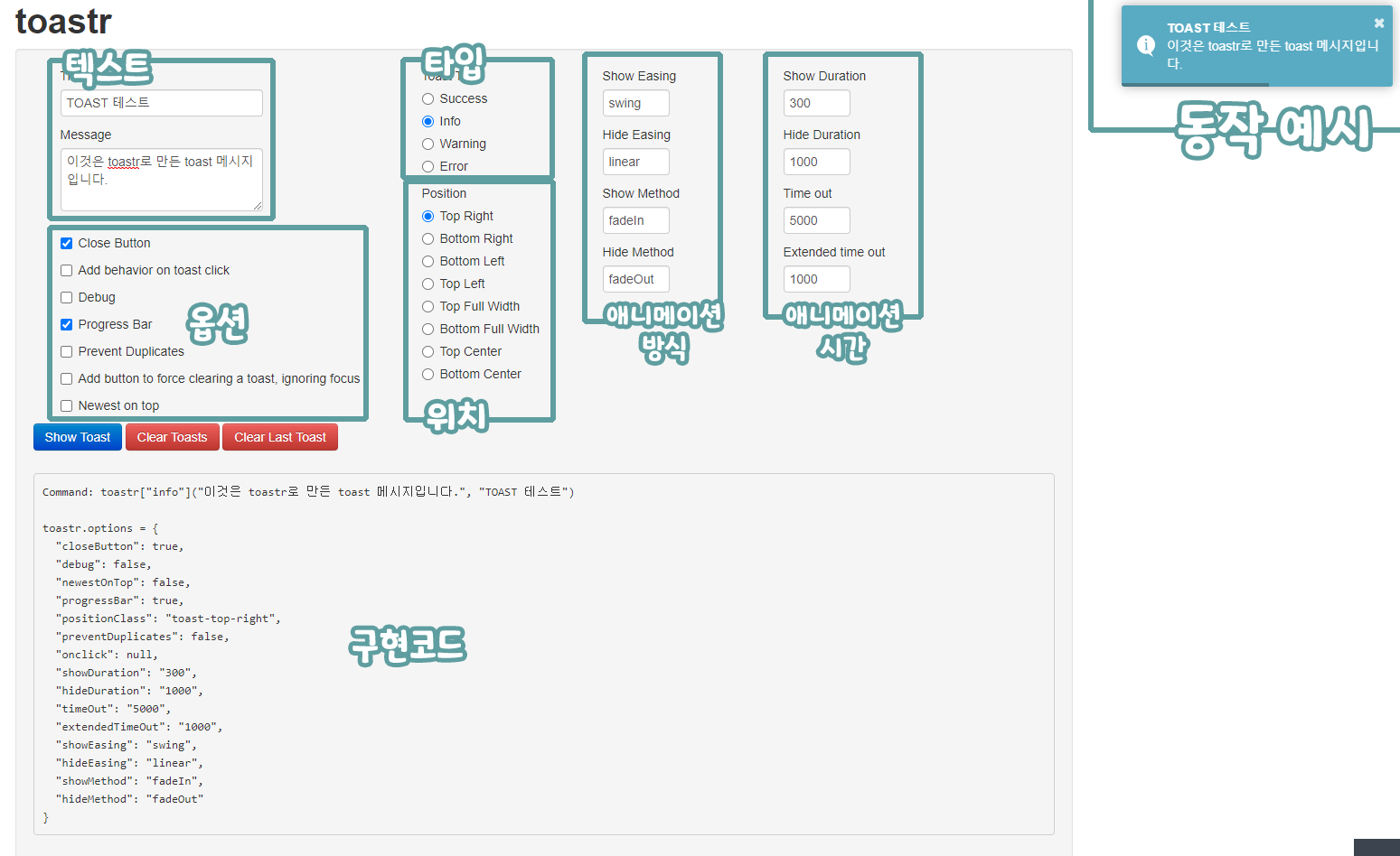 toastr은 플러그인 자체도 가벼워서 거리낌 없이 사용가능한것같고요. 쉬워서 설명이 별로 필요 없는 플러그인입니다.