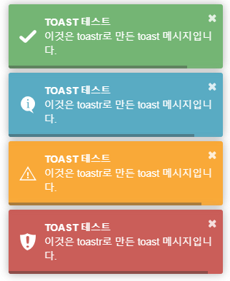 toastr 타입은 위의 이미지 순서대로 success, info, warning, danger 등 4가지를 지원하고 있습니다.