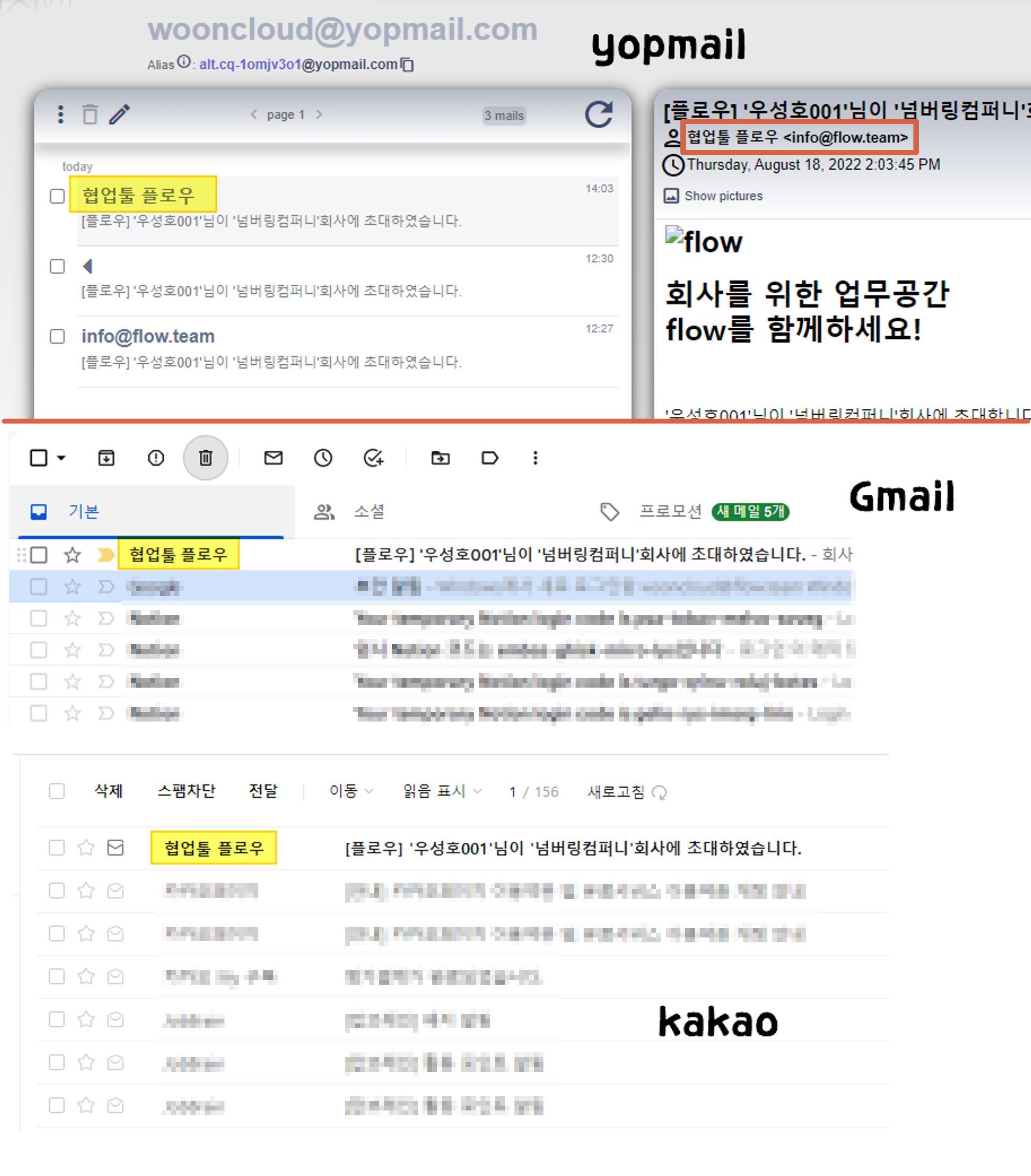 발신자 이름은 "협업툴 플로우" 라고 보냈습니다.