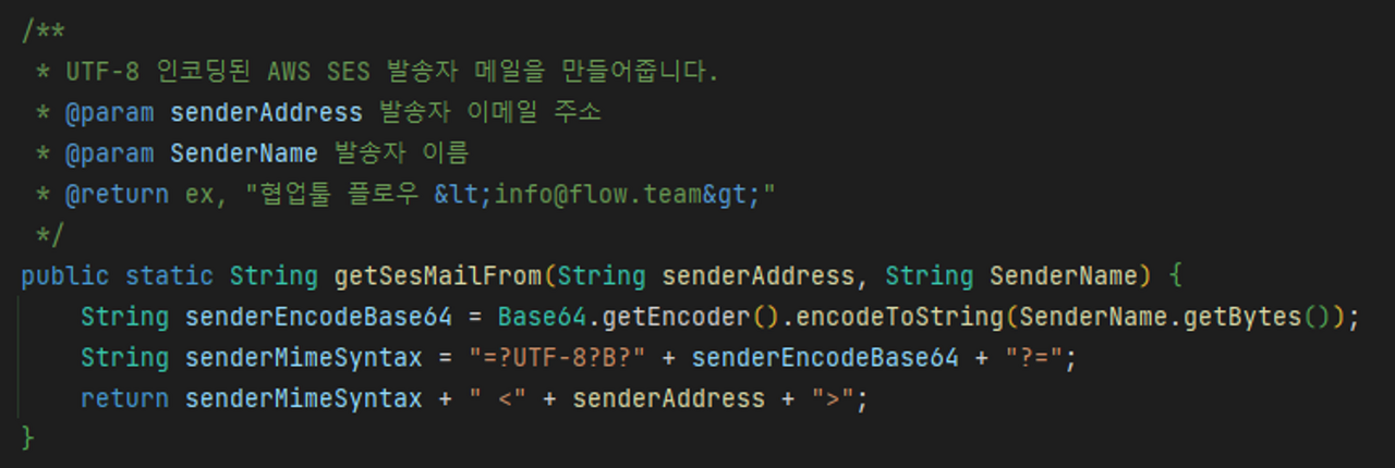 코드를 해석하자면, 저는 "협업툴 플로우 <info@flow.team>" 이라는 형식으로 발신자를 보내고 싶었습니다.