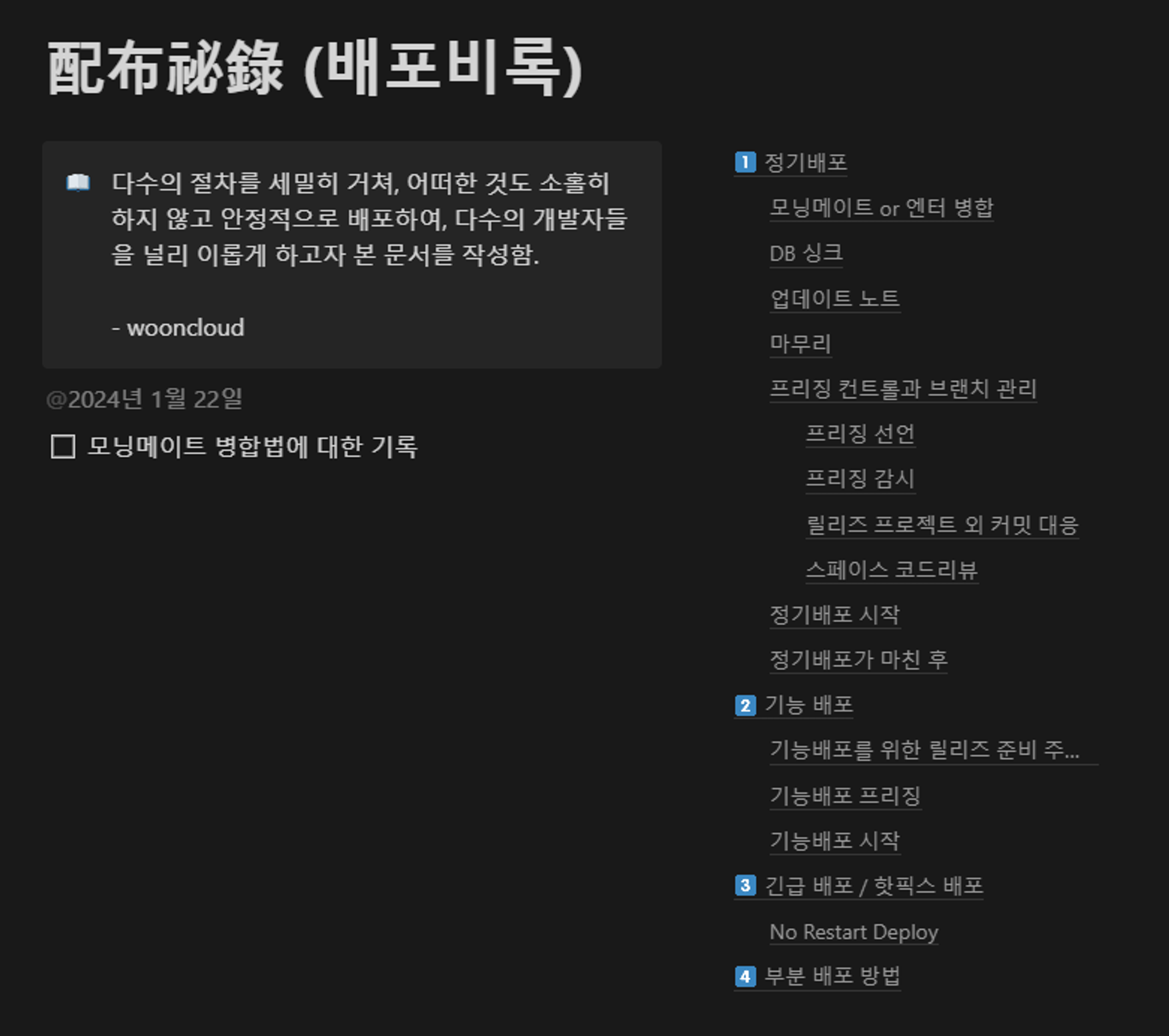 그래서 위의 사진처럼 9월부터 24년 1월까지의 배포에 관한 지식의 정수를 담은 문서를 만들고 다음 배포 담당자에게 권한을 위임했다. 열심히 문서를 만든 결과, 현재 배포담당자가 배포할 때 마다 문서를 보며 잘 진행하는 것을 보면 뿌듯하다.