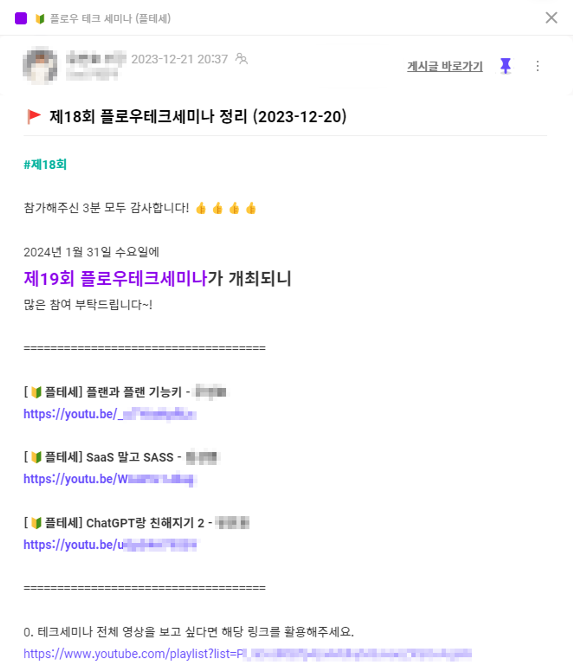 플테세는 플로우 테크 세미나라고, 개발자들이 자발적으로 참여하여 공유하고 싶은 기술과 지식을 발표하고 영상으로 남기는 문화이다. 매달마다 진행되며 상반기 회고에도 언급한적 있다.