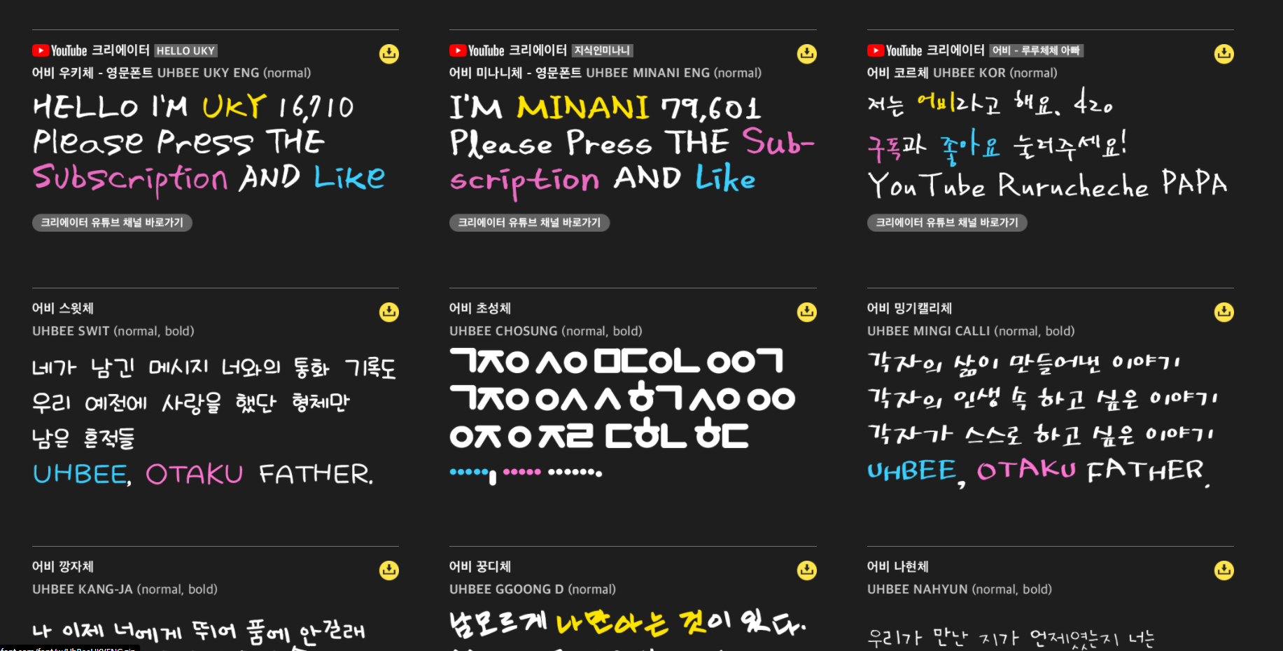 유튜브 크리에이터 '어비' 라는 분께서 여러 유튜버 손글씨체를 폰트로 담은 어비폰트입니다.