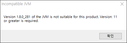 JVM 버전 1.8.0_281은이 제품에 적합하지 않습니다. 버전 : 11 이상이 필요합니다.