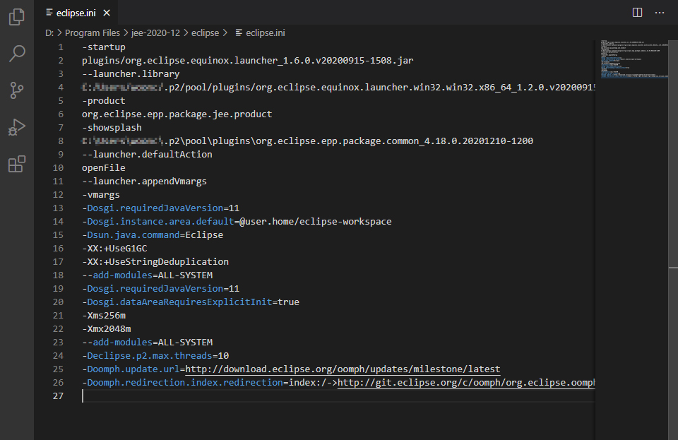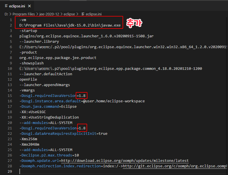 eclipse.ini에 이클립스를 실행시킬 가상머신의 PATH를 설정할 수 있습니다.
