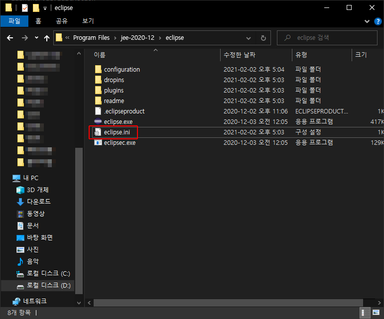 이럴때 이클립스가 설치된 폴더 안에 eclipse.ini을 열어서 수정하면 됩니다.