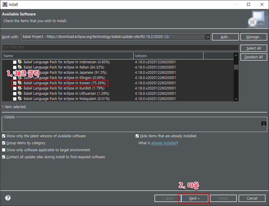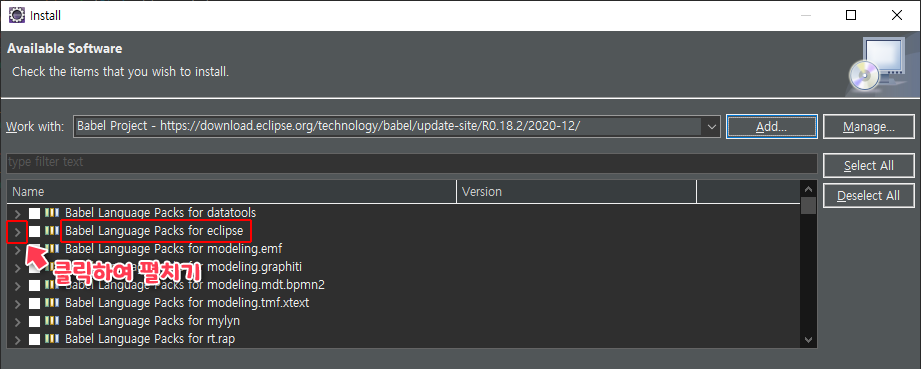 그중, 'Babel Language Packs for eclipse'라는 항목을 펼쳐줍니다.