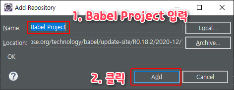 Name 항목에 'Babel Project'라고 입력하고 Add를 클릭합니다.