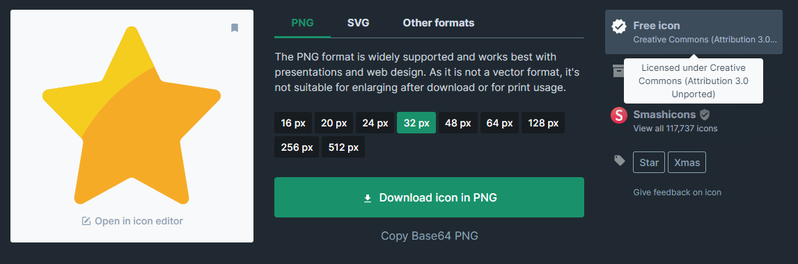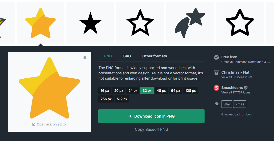 PNG의 경우 16px부터 512px까지 다운받을 수 있습니다.