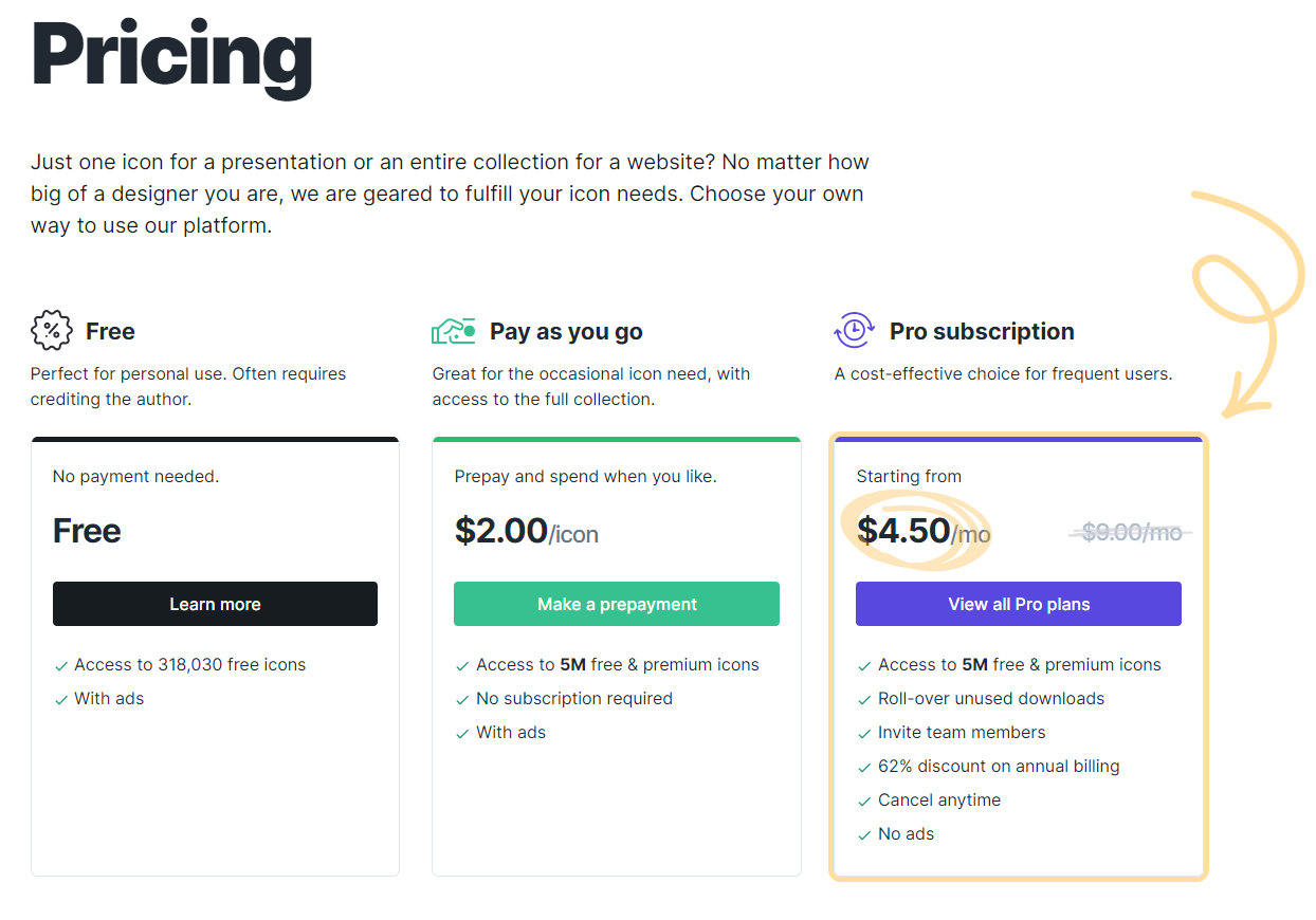 Subscription, Pay-As-You-Go, or just browsing for free icons? Choose your own way to use our platform.