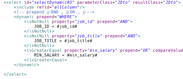 위의 XML과 같이 <select> <include> <dynamic> <isNotNull> 등등.. 그리고 parameterClass, resultClass, property, prepend, compareValue 등등 여러 키워드들을 알고 구조를 모두 알고 있기 때문에 작성을 쉽게 해 준다는 것입니다.