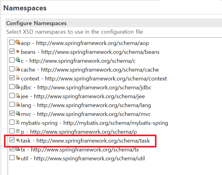 servlet-context.xml에 namespace에서 task를 추가합니다.