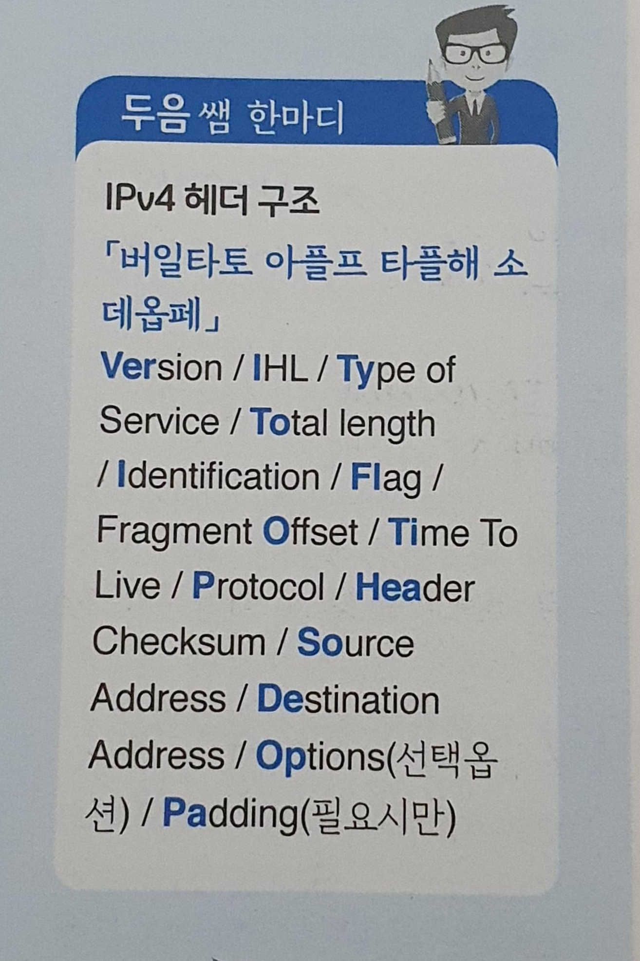 IPv4 헤더 구조도 어느 정도 알아야 하는 것 중 하나인데.. 오히려 저런 걸 외우는 게 더 도움 안되니까 거르시는 걸 추천드립니다.