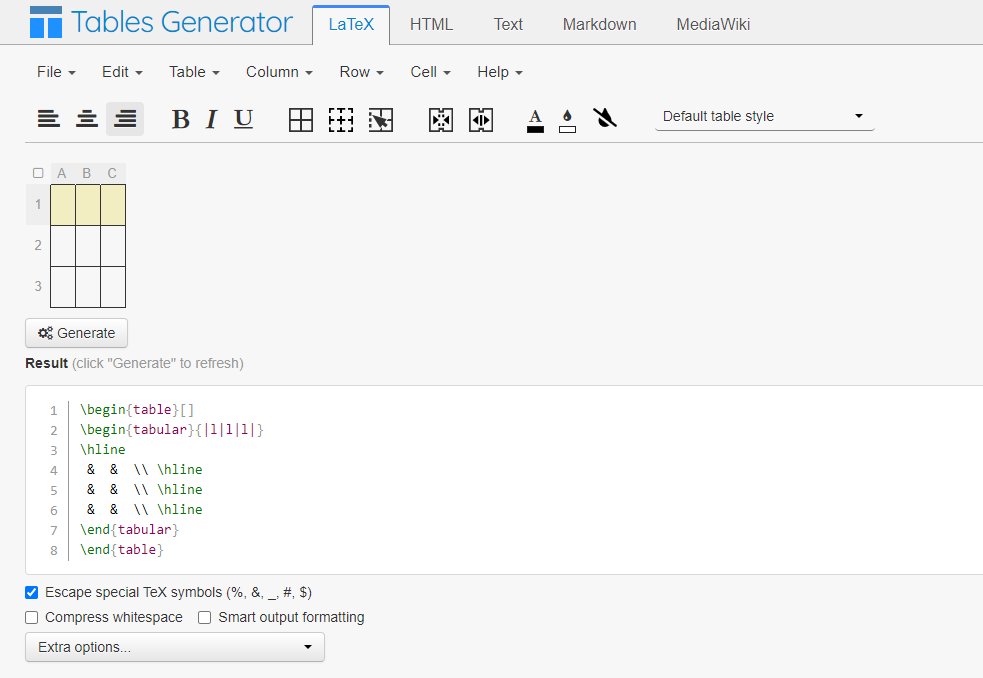 상단 네브바에 보시면 LaTeX, HTML, Text, Markdown, MediaWiki 등 표를 쉽게 작성할 수 있는 기능이 있습니다.