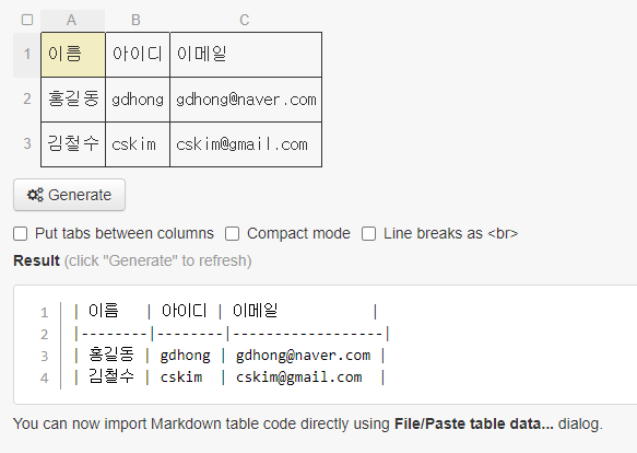Markdown 역시 Generate 하면 쉽게 Markdown 형식으로 표가 생성됩니다.