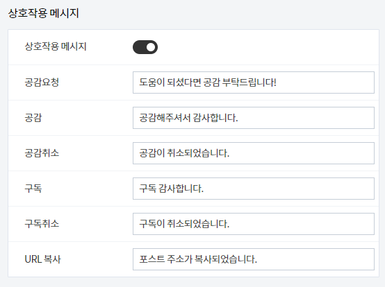 'URL 복사', '구독', '공감' 등 다양한 사용자의 행동에 반응하는 메시지를 표시해줍니다.