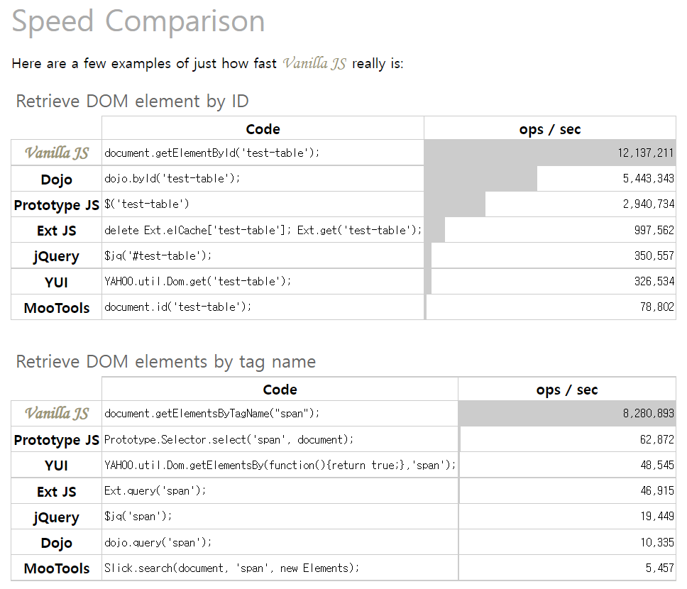 jQuery는 vanilla js에 비해 훨씬 무겁고 속도도 느립니다. 그리고 이제 크로스 브라우징을 위해 jQuery를 사용할 이유도 없어졌습니다. 앞으로 인터넷 익스플로러의 서비스가 중단되면 더더욱 사용할 필요가 없어지죠.
