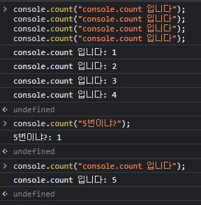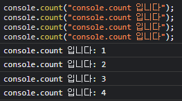 console.count()는 메시지와 함께 몇 번 실행되었는지 알 수 있습니다.