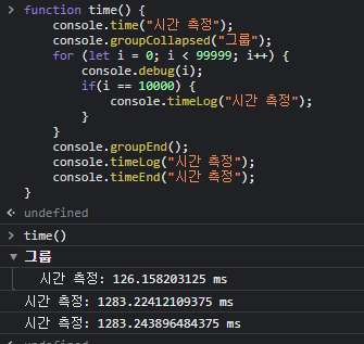 기본적으로 console.timeEnd()를 하면 시간이 얼마나 걸렸는지 결과를 알 수 있습니다.