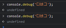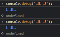 만약 console.debug()를 보고 싶으시면 콘솔 우측 상단에 Default levels를 클릭하여 Verbose를 체크해 주세요.
