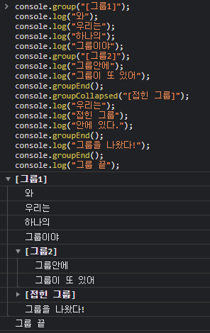 console.group()이 시작된 이후 log는 console.groupEnd()을 만나기 전까지 한 그룹으로 묶입니다.