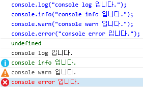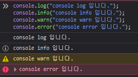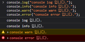 하지만 log 함수 말고 info, warn, error 함수가 있습니다.