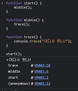console.trace() 특정 코드가 어느 경로를 통해 실행되는지 알고 싶을 때, 유용하게 쓸 수 있는 함수입니다.