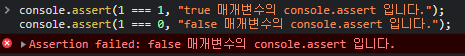 console.assert()는 첫번째 매개변수가 true일 경우 콘솔에 출력하지 않고, false일 경우 콘솔에 메시지를 출력합니다.