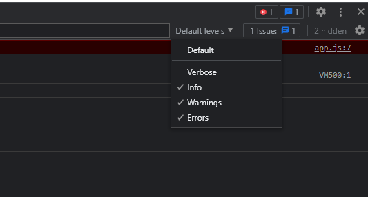 크롬에서 기본적으로 Default levels로 잡혀있기 때문에, 자동으로 console.debug()의 로그 내용을 사용자로부터 숨길 수 있습니다. 하지만, 다른 브라우저에서는 기본으로 debug도 나오는 곳이 있기 때문에 참고하셔야 합니다.