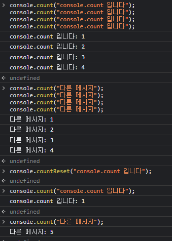 console.countReset()는 매개변수의 메시지의 카운트를 초기화합니다.