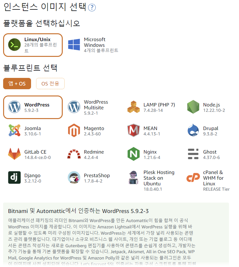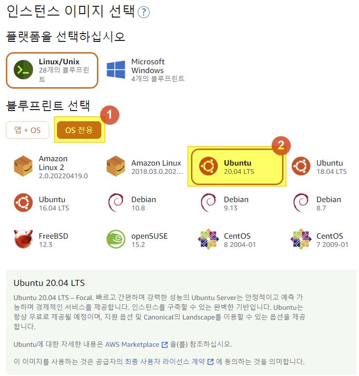 저처럼 우분투 환경을 원하시는 분은 '블루프린트 선택' 아래에 있는 "OS 전용" 버튼을 클릭해주세요.