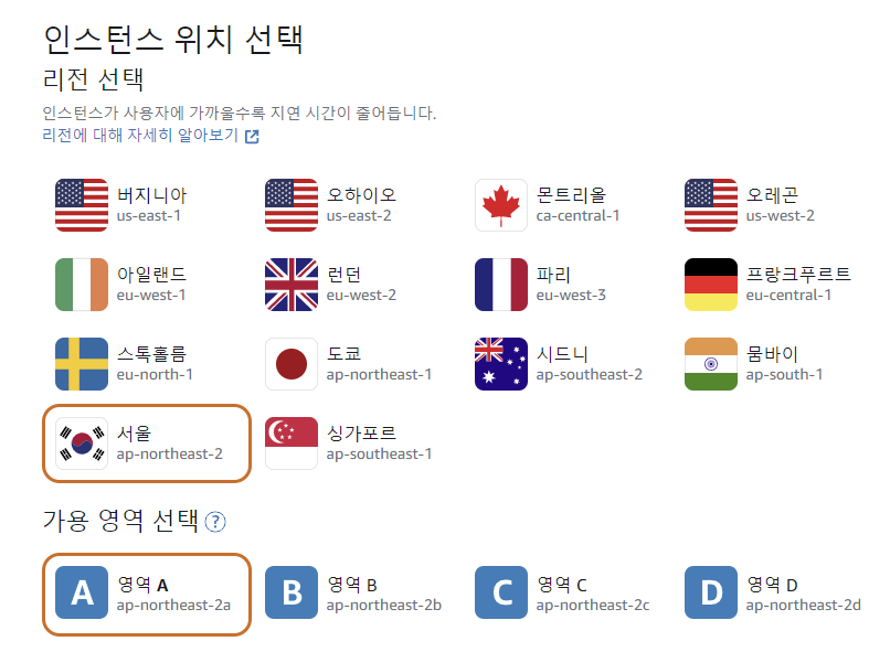 당연하게도 한국에서는 서울 리전으로 선택해야 물리적으로 빨라집니다. 서울로 선택해줍니다.