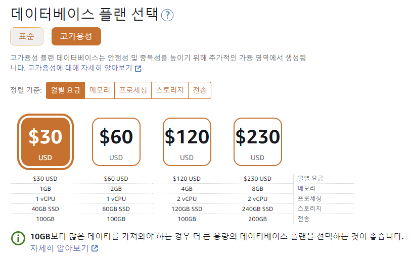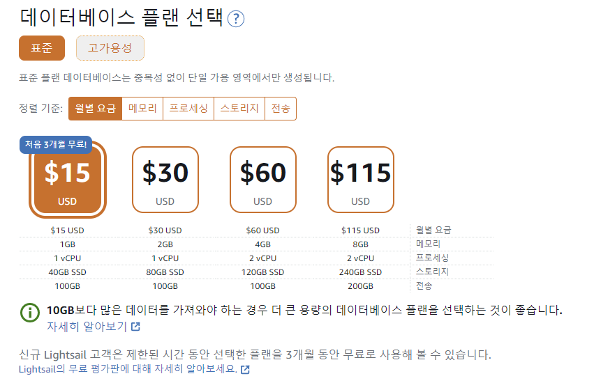 데이터베이스 플랜은 표준 플랜과 고가용성 플랜이 있습니다.