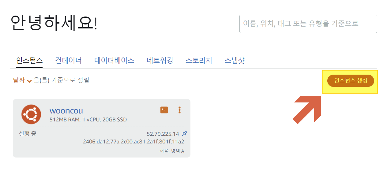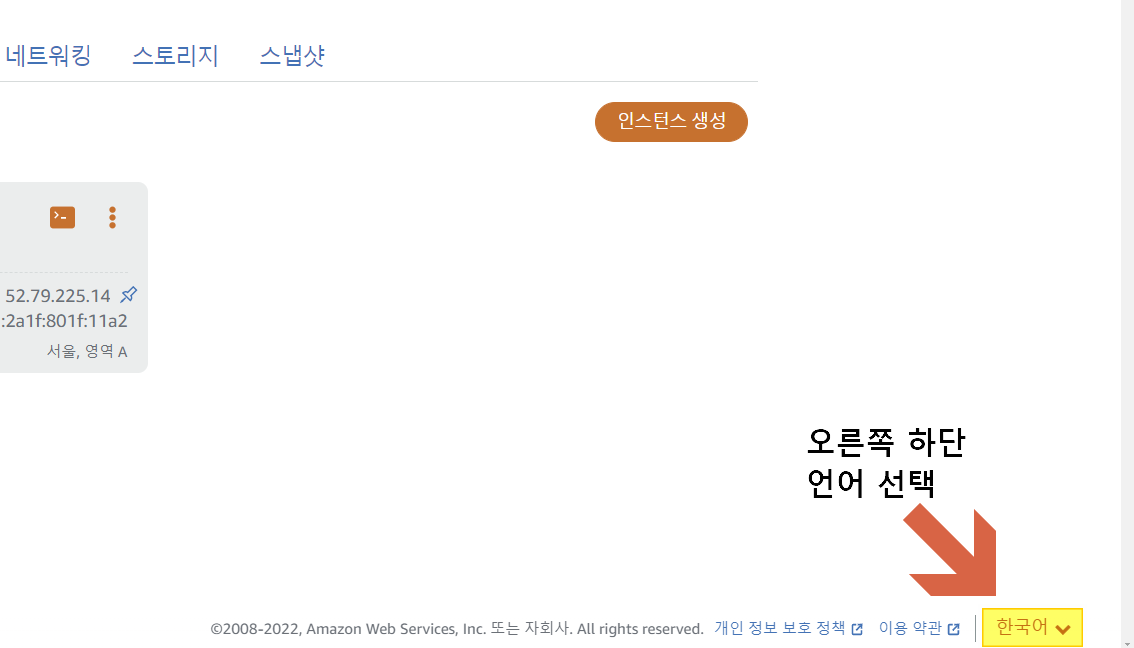 실제로 인스턴스를 생성해보겠습니다. 처음에 UI가 영어로 나온다면 우측 하단에 한국어로 변경할 수 있습니다.