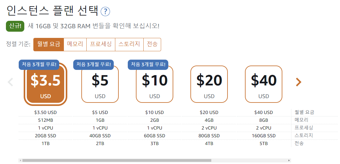 저는 처음이니 3.5달러 플랜을 선택했습니다.