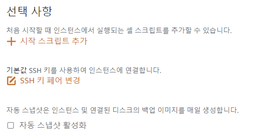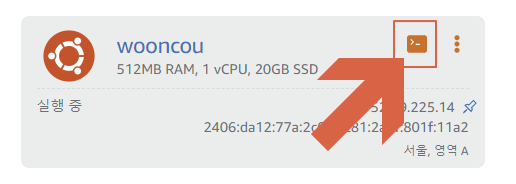 인스턴스가 생성되면 위의 터미널 마크를 이용하여 SSH에 접속할 수 있습니다.