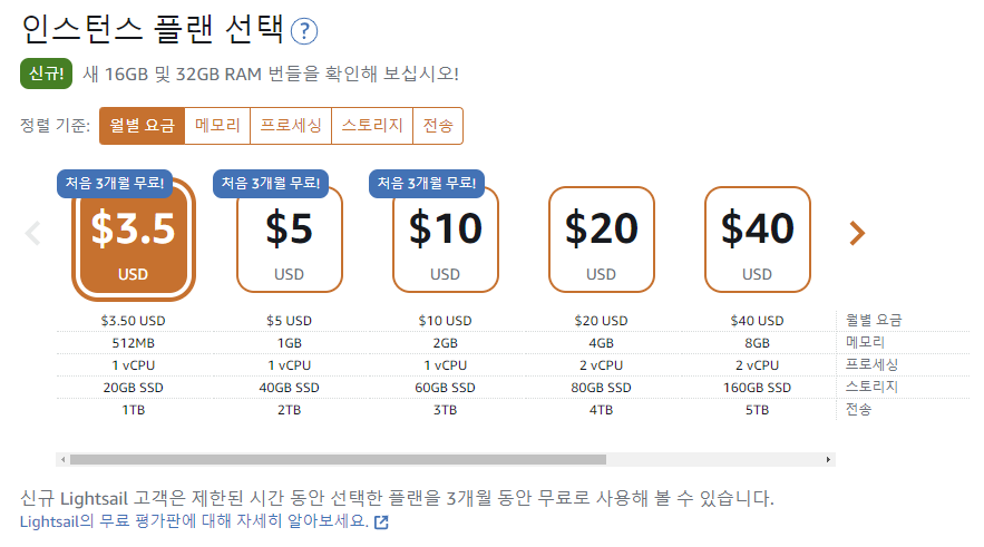 https://aws.amazon.com/ko/lightsail/pricing/?loc=ft#AWS_Free_Tier