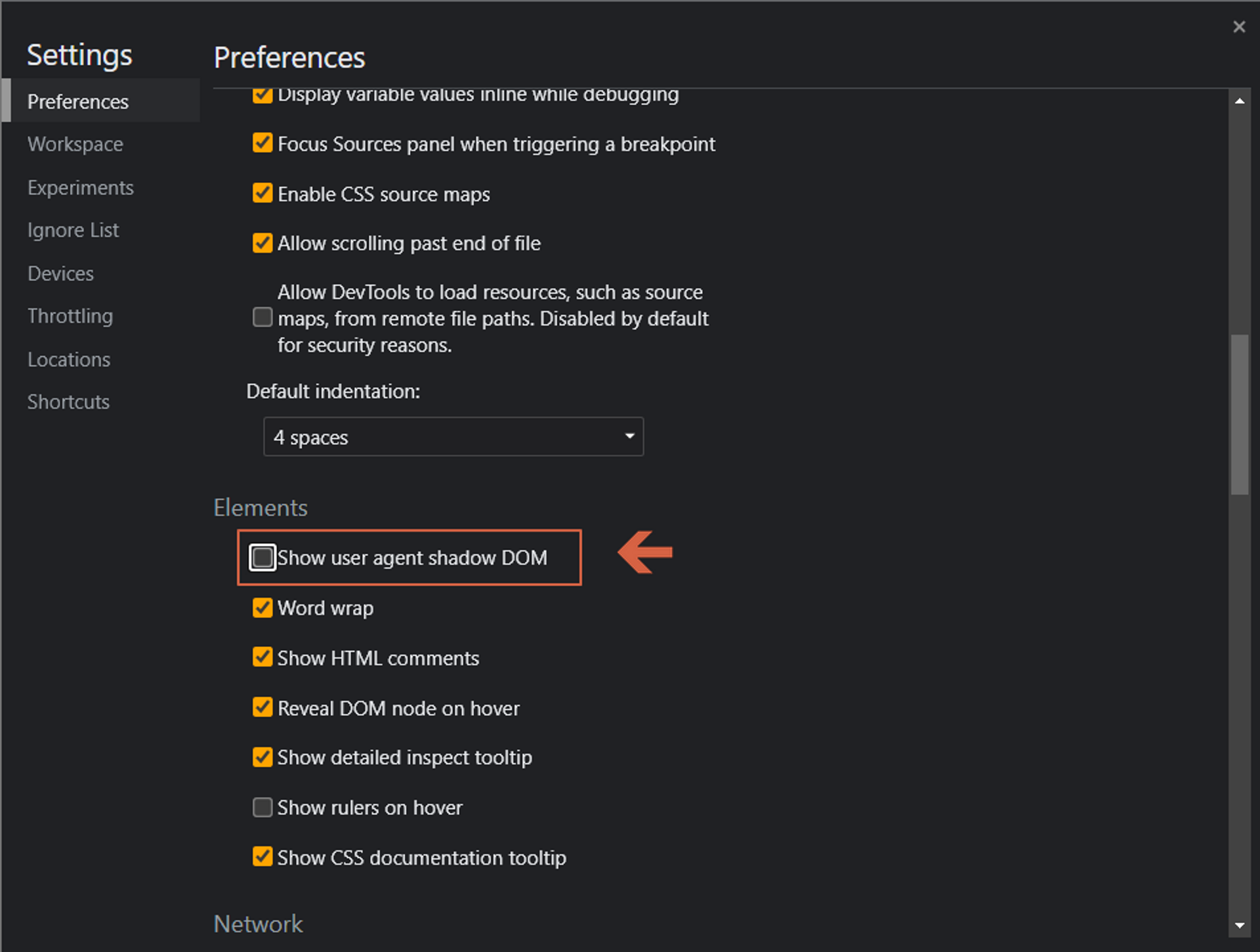 - 이 아이콘을 누르고 중간지점 Elements 설정의 첫 번째 “Show user agent shadow DOM”라는 체크박스를 활성화합니다.
